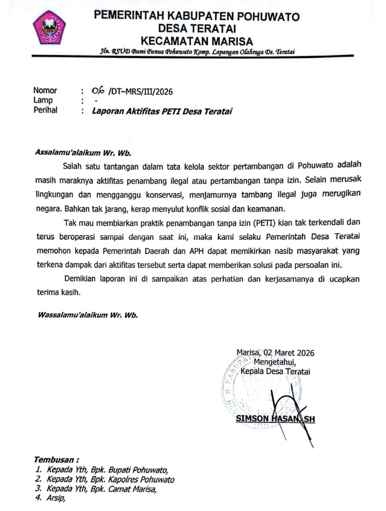 Pohuwato – Pemerintah Desa (Pemdes) Teratai, Kecamatan Marisa, Kabupaten Pohuwato, Provinsi Gorontalo, akhirnya melayangkan surat resmi kepada Kapolres Pohuwato, Bupati Pohuwato, dan Camat Marisa terkait maraknya aktivitas Pertambangan Emas Tanpa Izin (PETI) yang masih terus beroperasi di wilayah mereka.