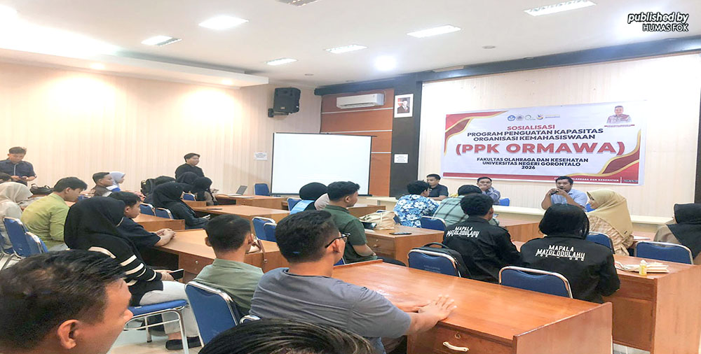 UNG – Fakultas Olahraga dan Kesehatan (FOK) Universitas Negeri Gorontalo (UNG) menggelar Sosialisasi Program Penguatan Kapasitas Organisasi Kemahasiswaan (PPK Ormawa) di Aula FOK UNG. Kegiatan ini resmi dibuka oleh Wakil Dekan Bidang Kemahasiswaan dan Alumni, Edy Dharma Putra Duhe, S.Pd., M.Pd., yang menegaskan pentingnya peran organisasi kemahasiswaan dalam pengembangan karakter dan kapasitas mahasiswa.