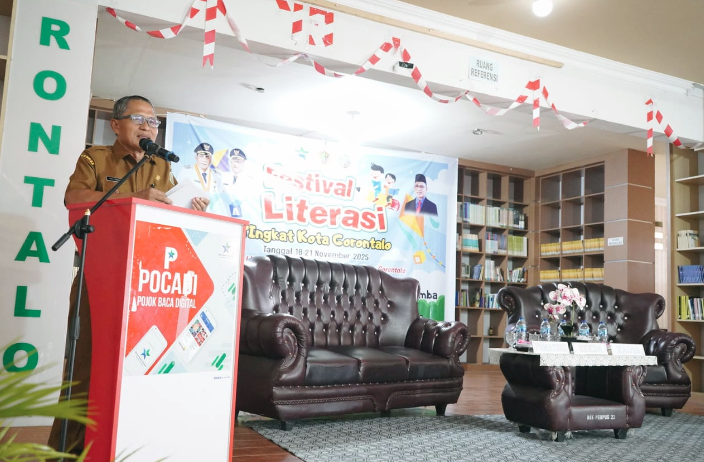 Kota Gorontalo – Festival Literasi Gorontalo 2025 yang digelar Dinas Kearsipan dan Perpustakaan Kota Gorontalo berlangsung meriah di Perpustakaan Daerah, Selasa (18/11). Acara tersebut dibuka langsung oleh Sekretaris Daerah (Sekda) Kota Gorontalo, Ismail Madjid, yang hadir mewakili Wali Kota Gorontalo, Adhan Dambea.